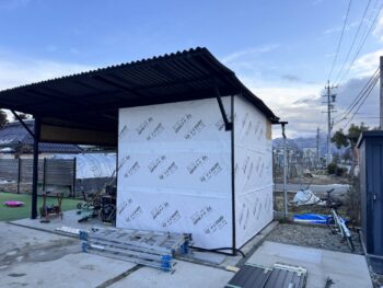 鉄骨造にOSB合板張り、タイベックを巻いて角リブにて施工。